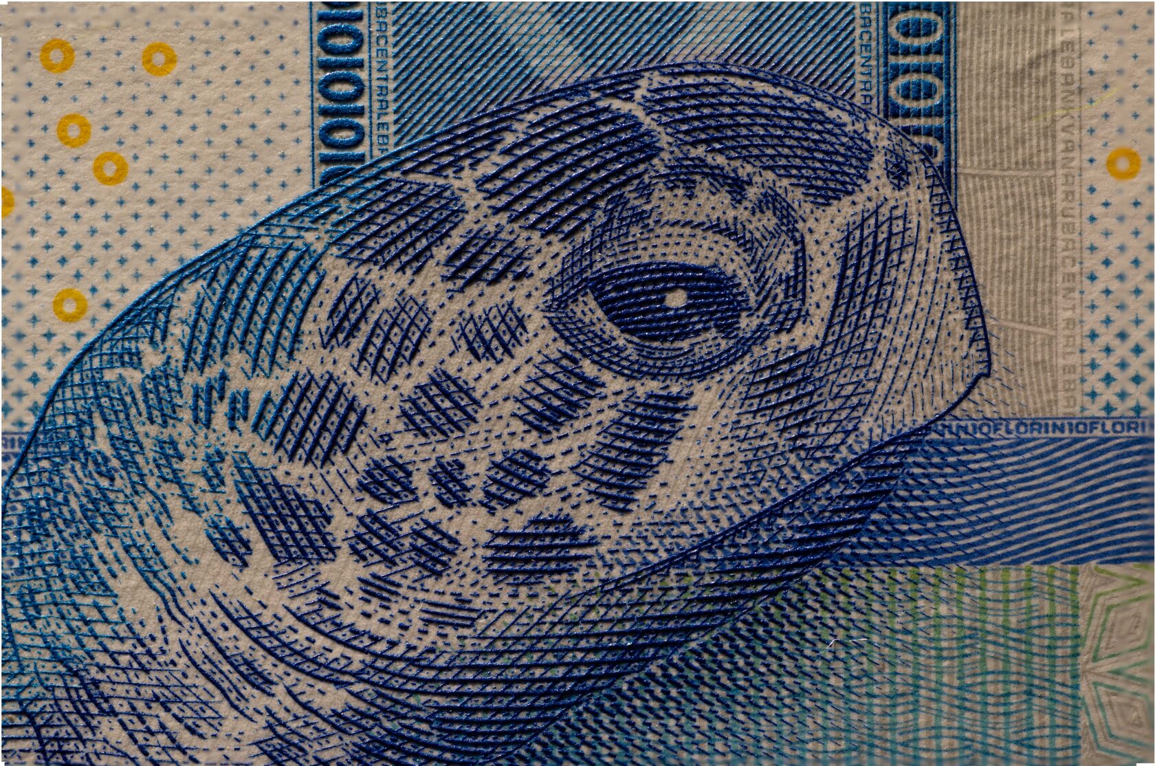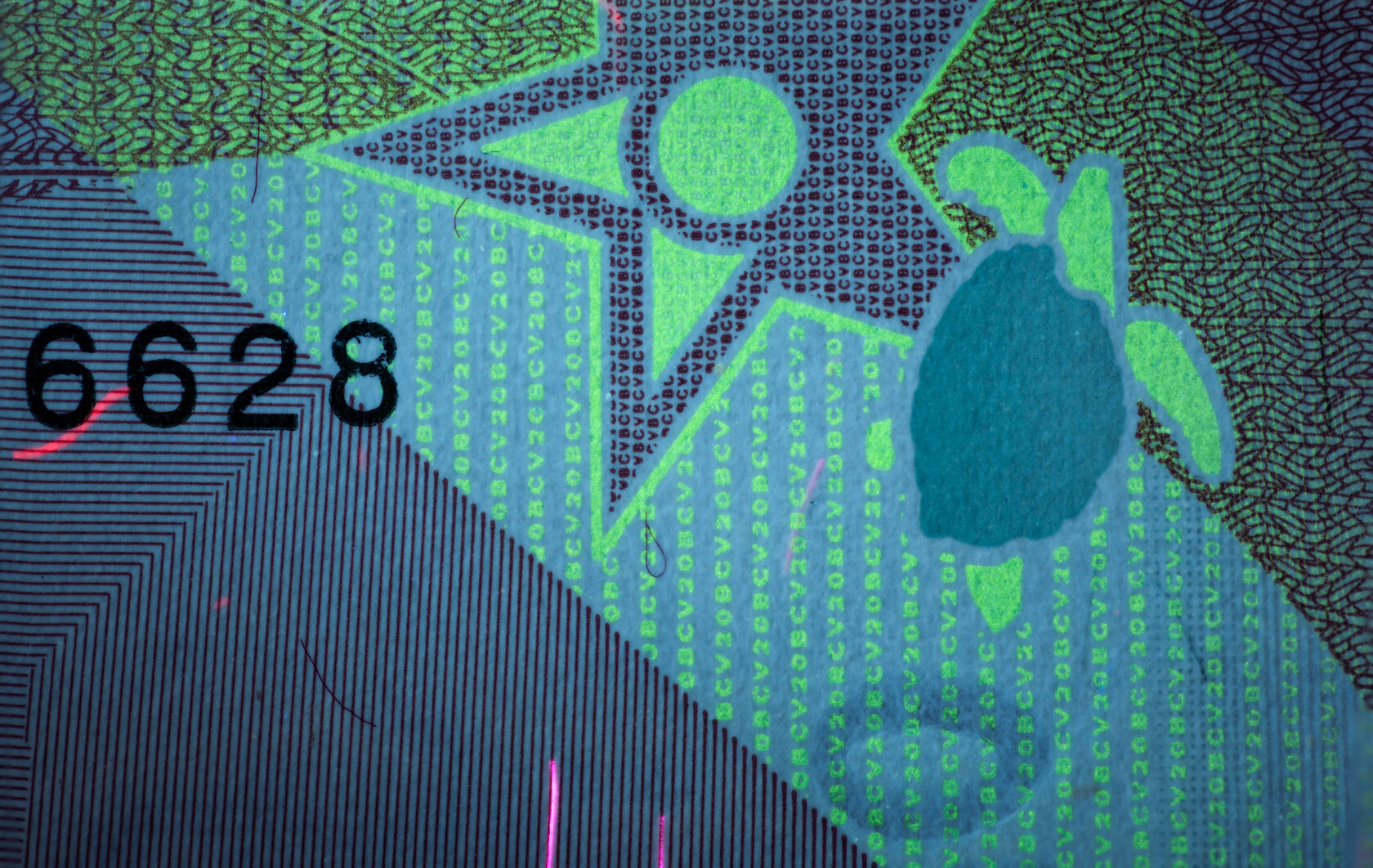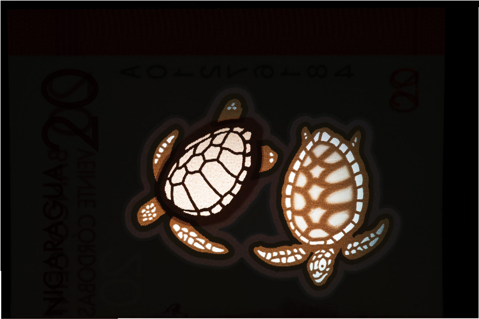 На банкнотах применяются различные степени защиты от подделок. Кроме ультрафиолета используются прозрачные ... Вот как быглядят две черепахи на банкноте в 20